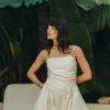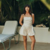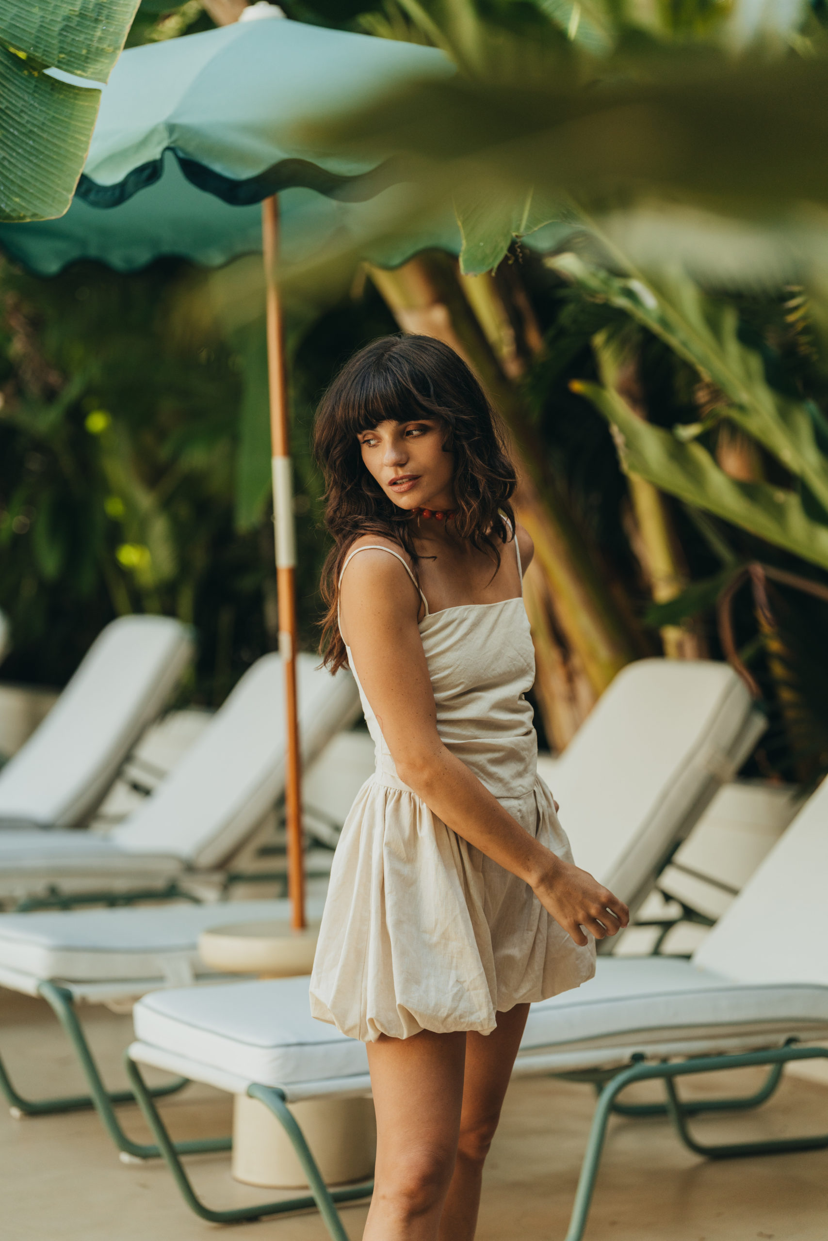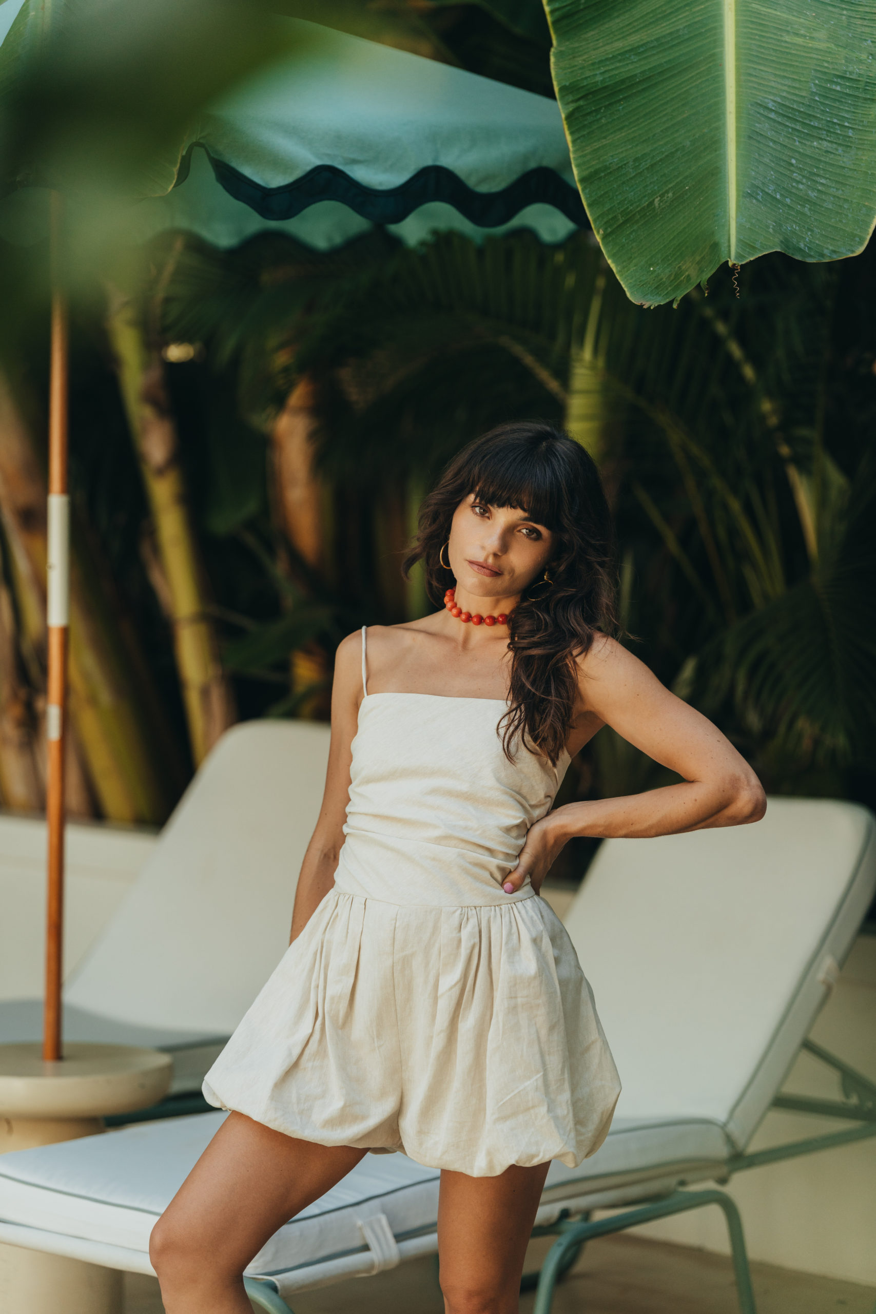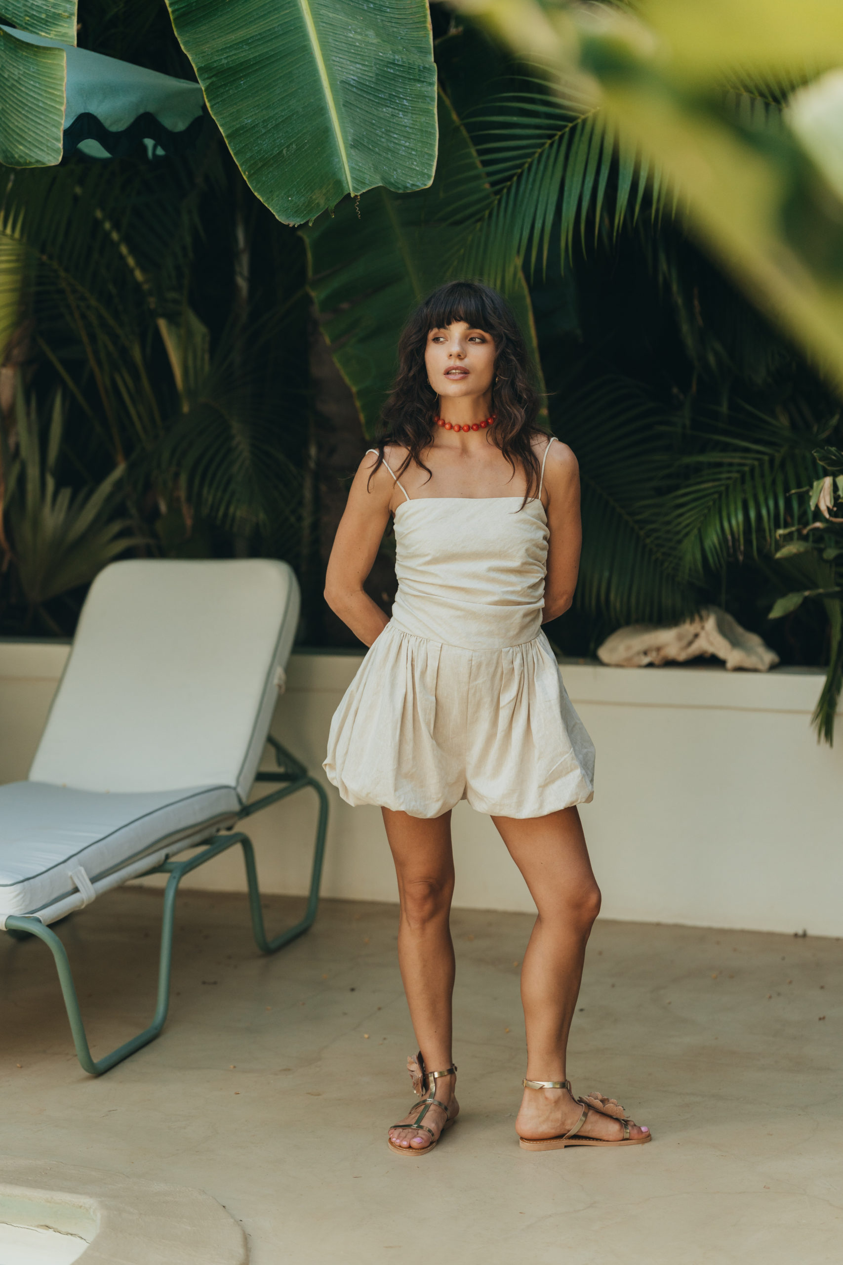 Confectionnée en 100 % lin, avec des plis sur le short pour marquer la taille, et de fines bretelles au dos à nouer pour ajuster le haut avec délicatesse.